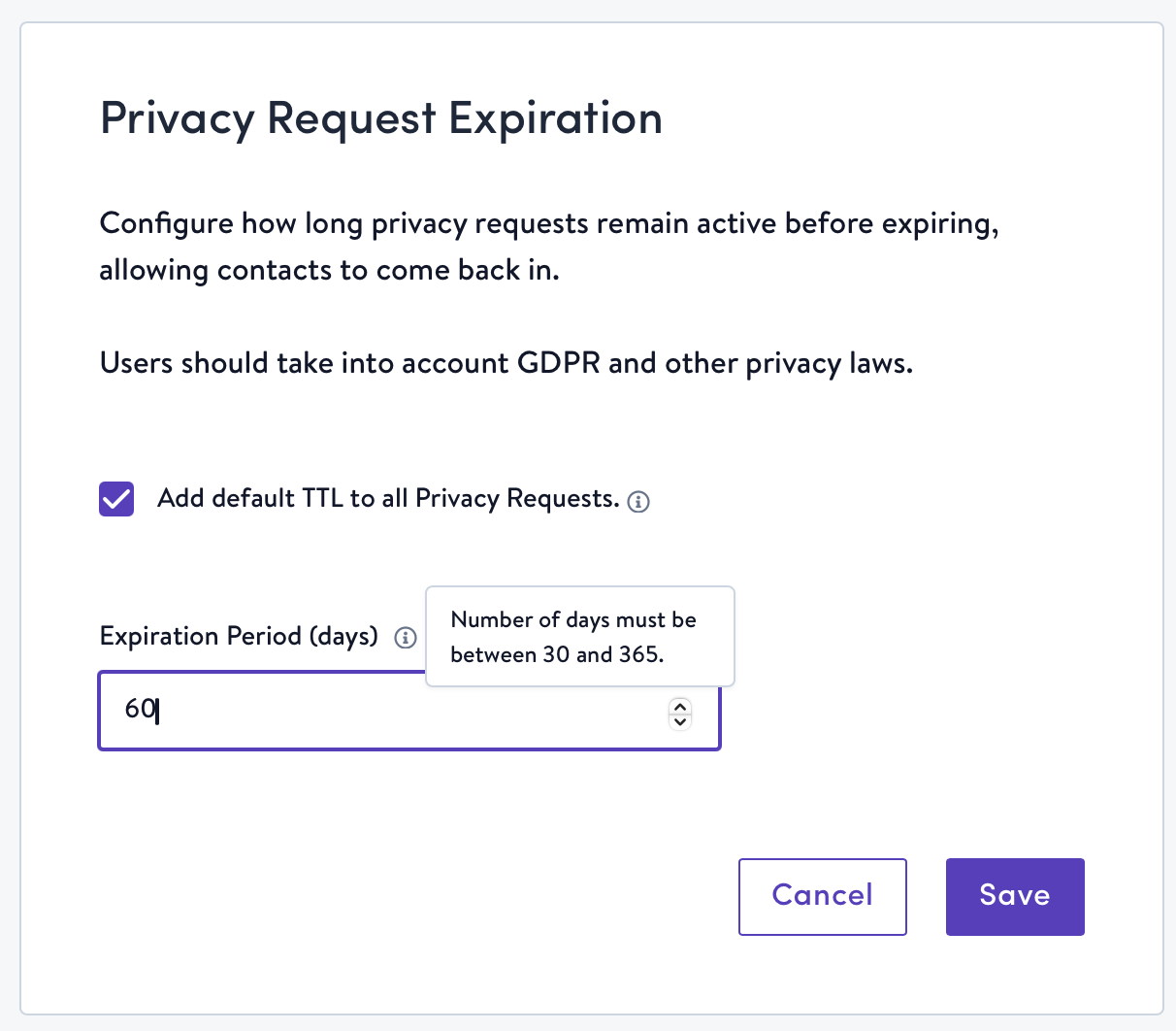 • Privacy Request Expirations: You are now able to configure how long submitted privacy requests remain active before expiring, which then allows contacts to re-enter your Simon instance after a certain amount of time. TTL (time-to-live) is the number of days after which privacy requests expire and previously denylisted contacts are able to re-enter your Simon instance if they re-engage with your brand (e.g. sign up again for marketing emails, make a purchase, etc.).