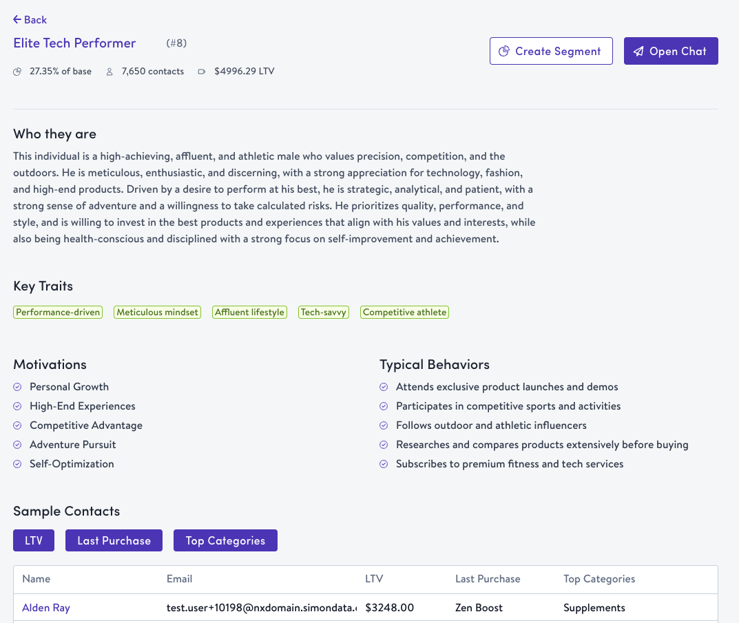 | Sample contacts | A preview of representative contacts with email, LTV, last purchase date, and top categories |