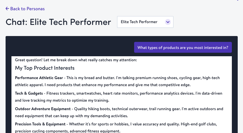- Specific Persona — Chat directly with a persona character. The AI responds as that persona in first person, so you can test messaging ideas and get authentic reactions. Try "What kind of emails actually get you to open them?" or "If you saw a 20% off sale, would that get you excited?"