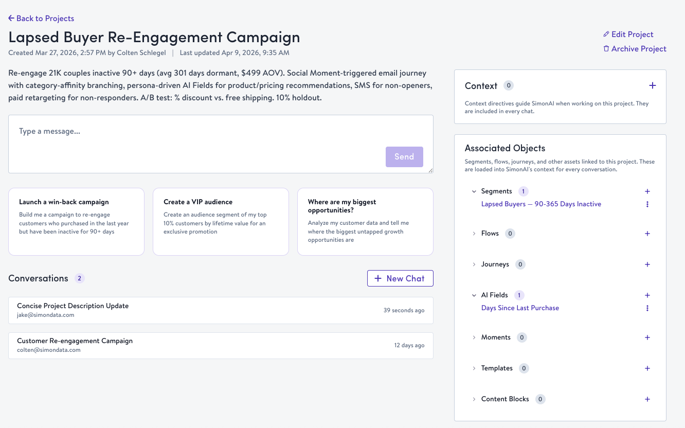 Projects are goal-based campaign workspaces in Simon AI. Create a Project around a specific business objective — like "increase 90-day repurchase rate" or "reactivate lapsed apparel buyers" — and everything you build toward that goal lives in one place.